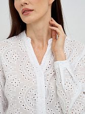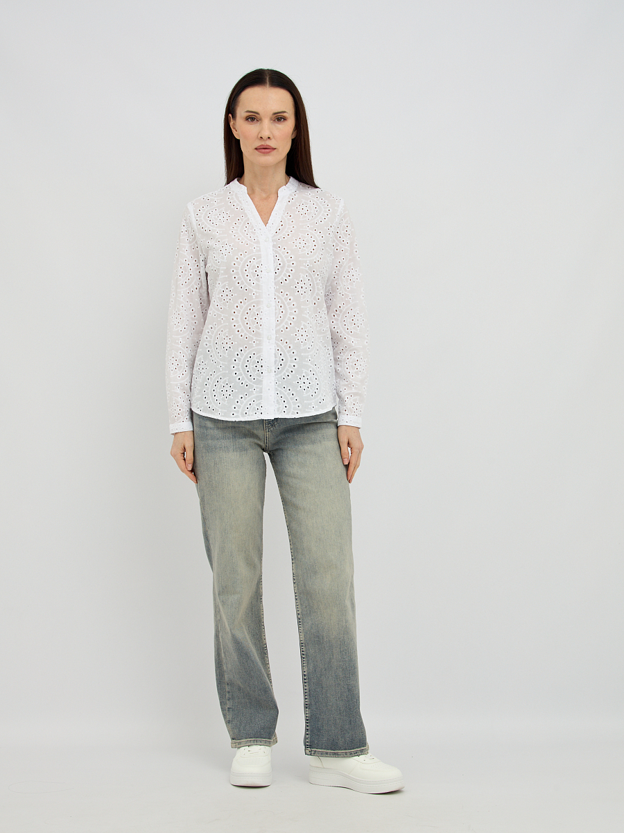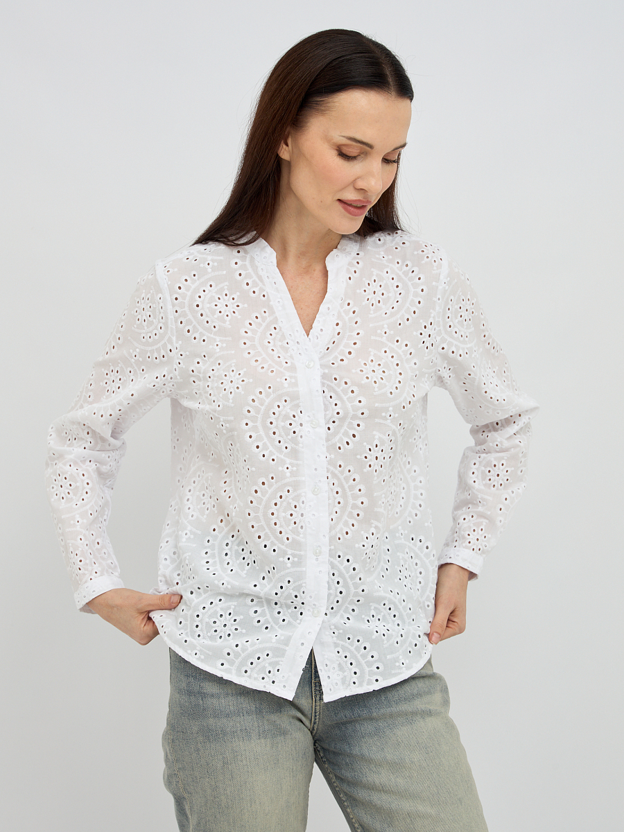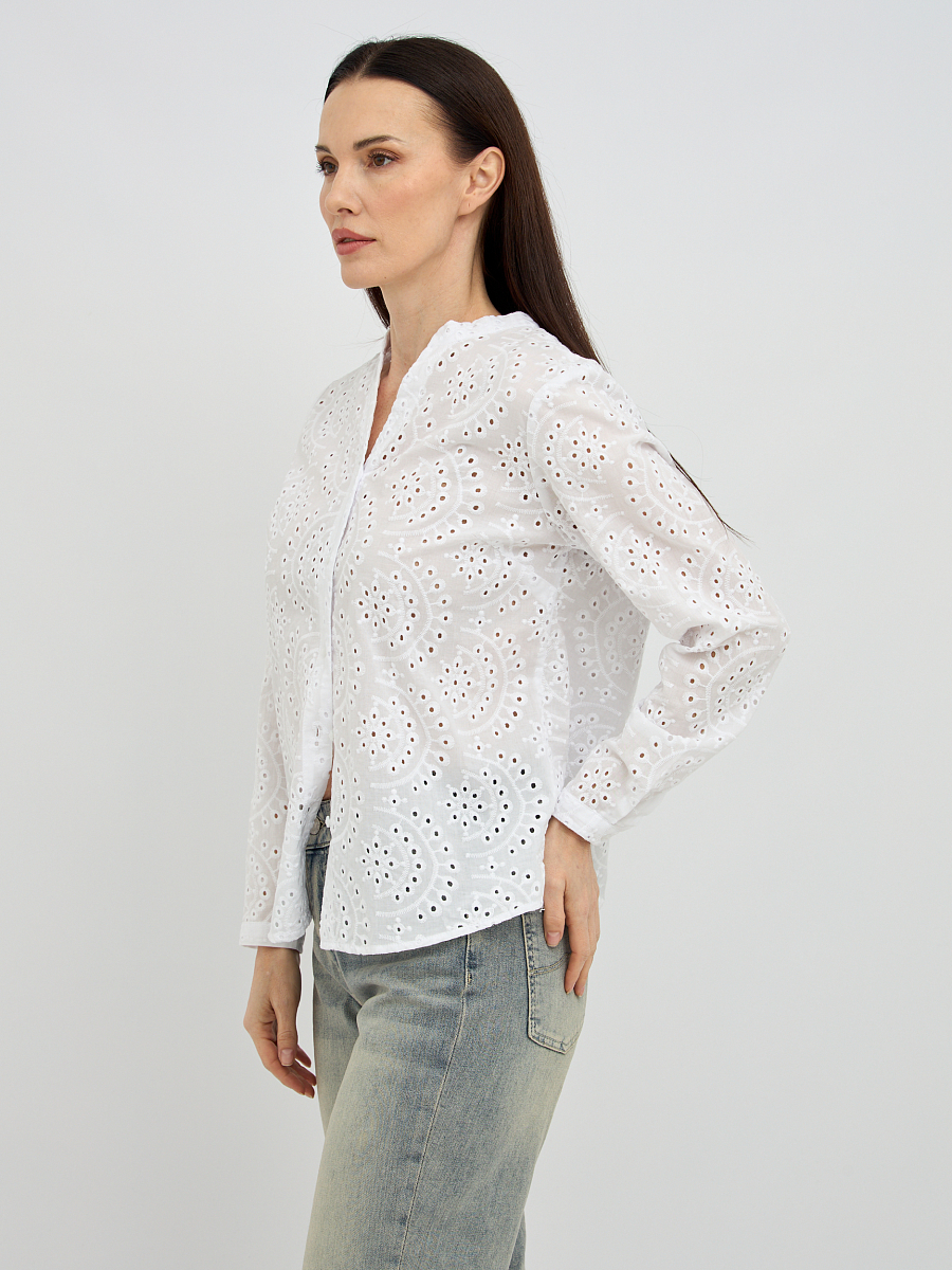Нежный цветочный узор, созданный перфорацией, добавляет изделию изысканности и объема, превращая обычную блузку в настоящее произведение искусства. Такой дизайн не только придает образу легкости и воздушности, но и обеспечивает дополнительную вентиляцию, что является неоспоримым преимуществом в теплую погоду.
