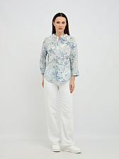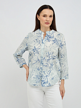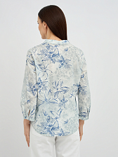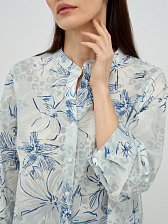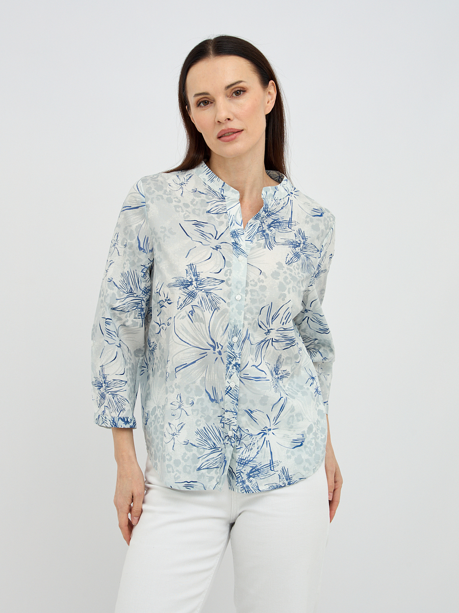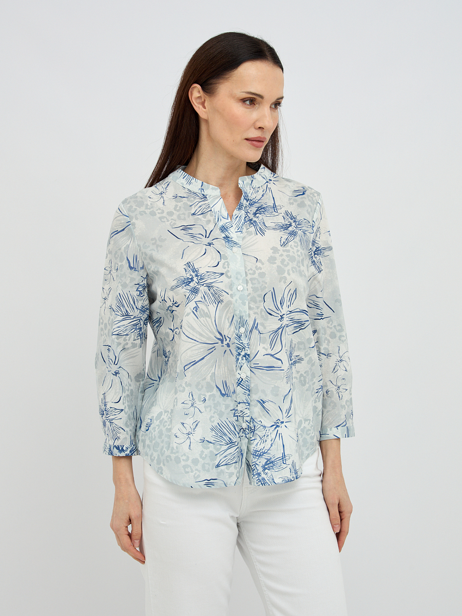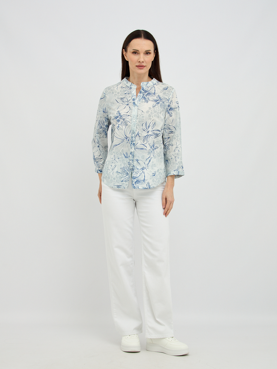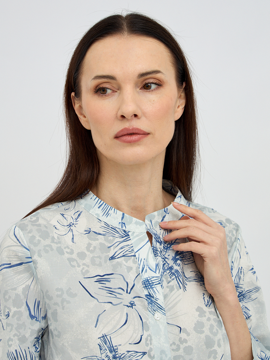 Оригинальный дизайн с воротником-стойкой добавляет блузке современности и утонченности, а V-образный вырез придает образу женственности. Рукава длиной три четверти выглядят стильно и практично, легко подворачиваются для более непринужденного вида. Деликатный цветочный узор в голубых тонах придает блузке свежесть и романтичность, легко сочетаясь с различными элементами гардероба.
