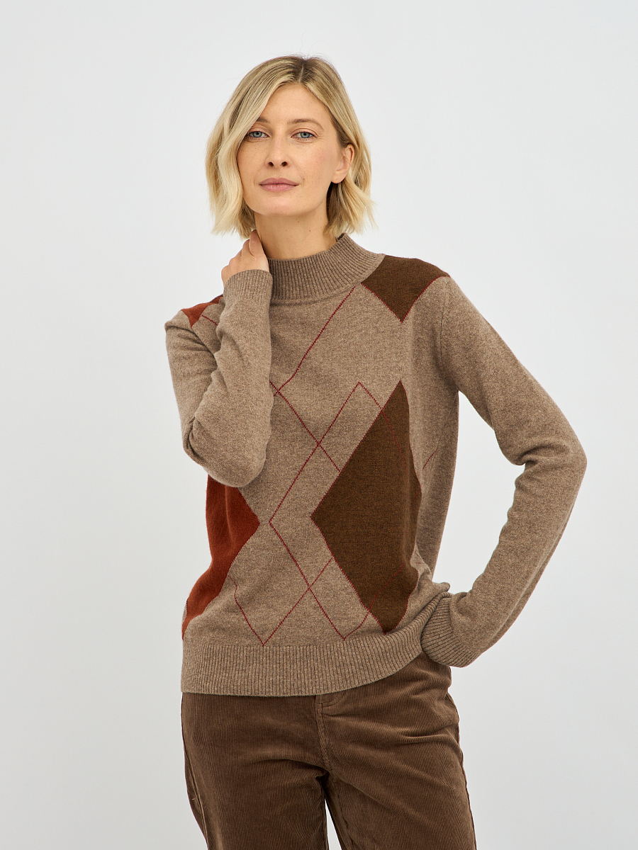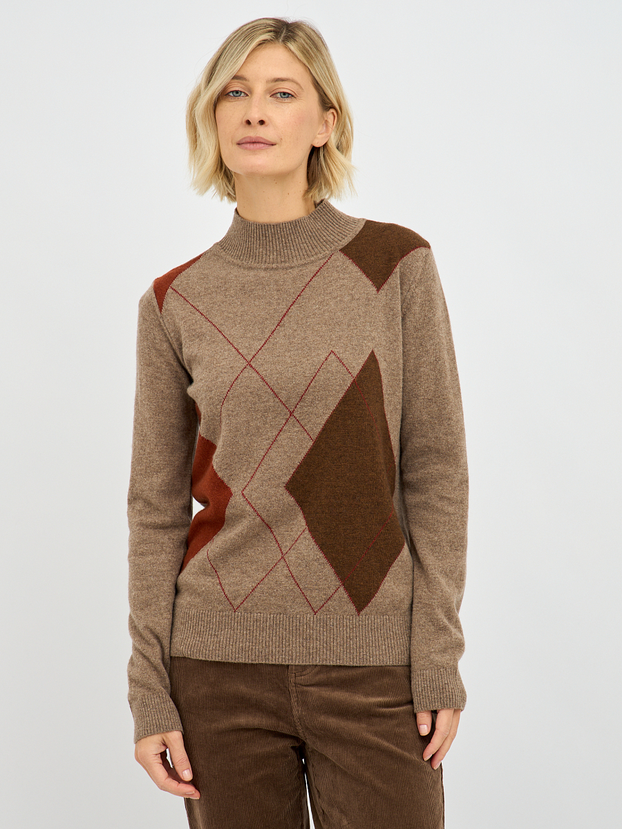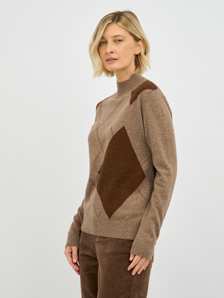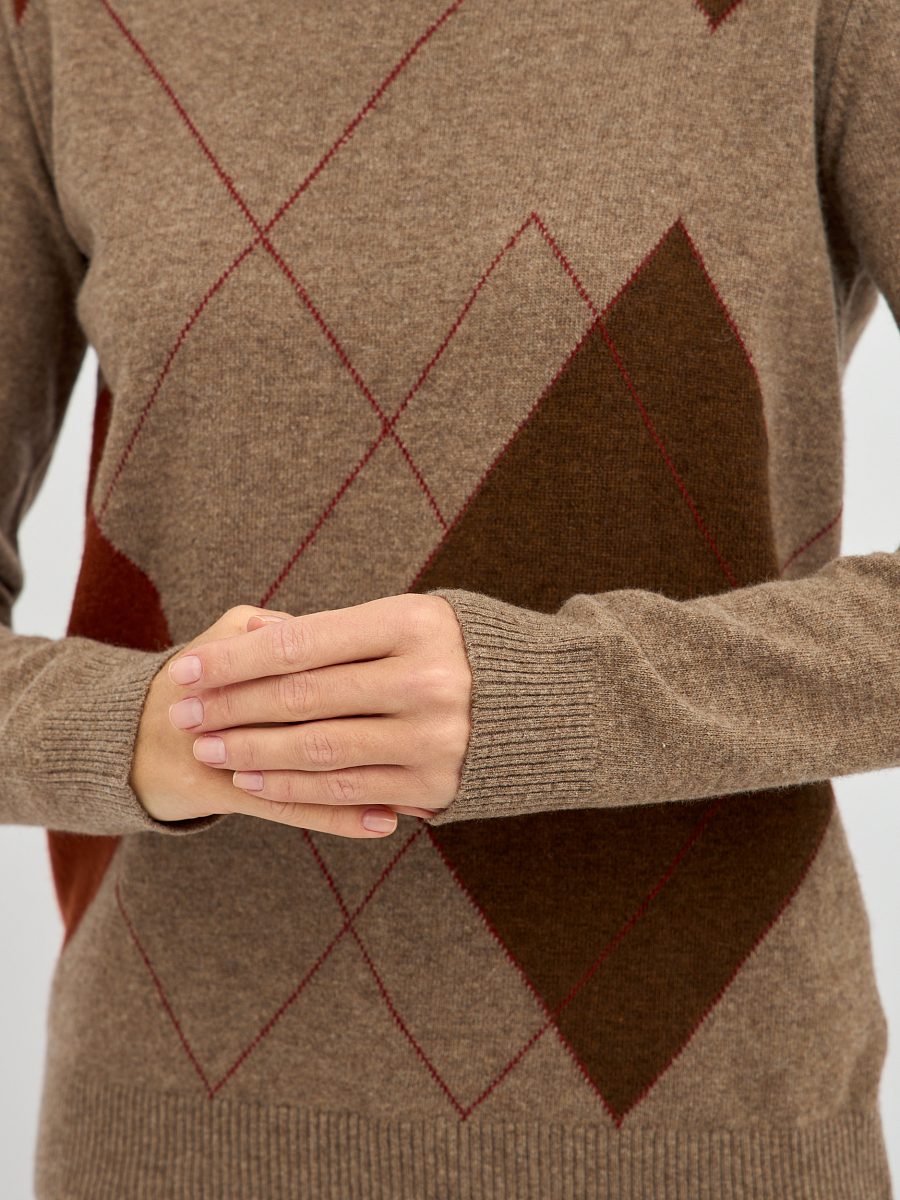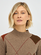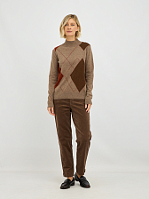 Классический высокий воротник-стойка не только согреет в прохладные дни, но и добавит образу благородства, подчеркивая изящность шеи. Главной изюминкой дизайна является эффектный геометрический орнамент в виде ромбов, выполненный в контрастных оттенках коричневого, который придает водолазке стильный и запоминающийся вид. Благодаря продуманному крою, модель идеально садится по фигуре, подчеркивая достоинства и создавая гармоничный силуэт.