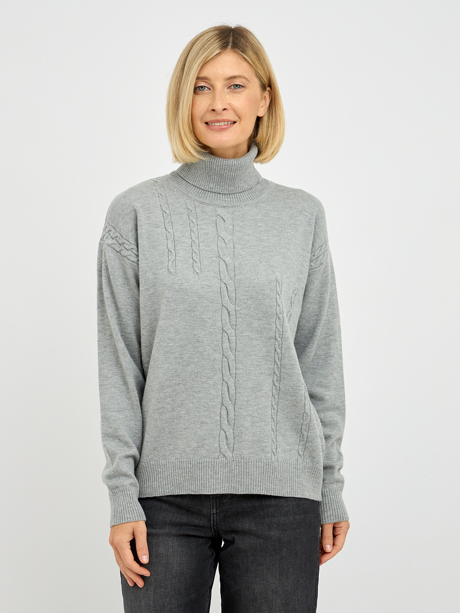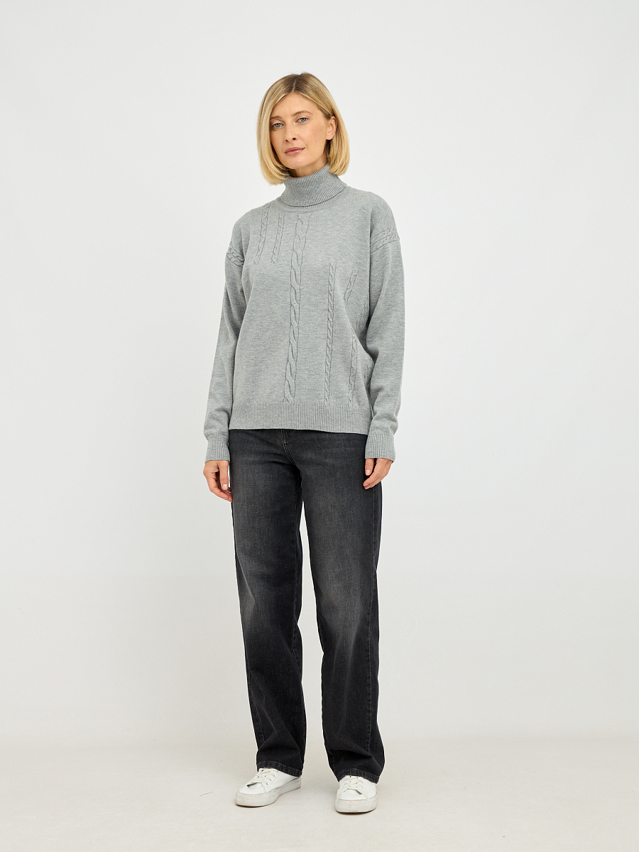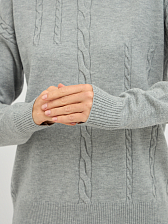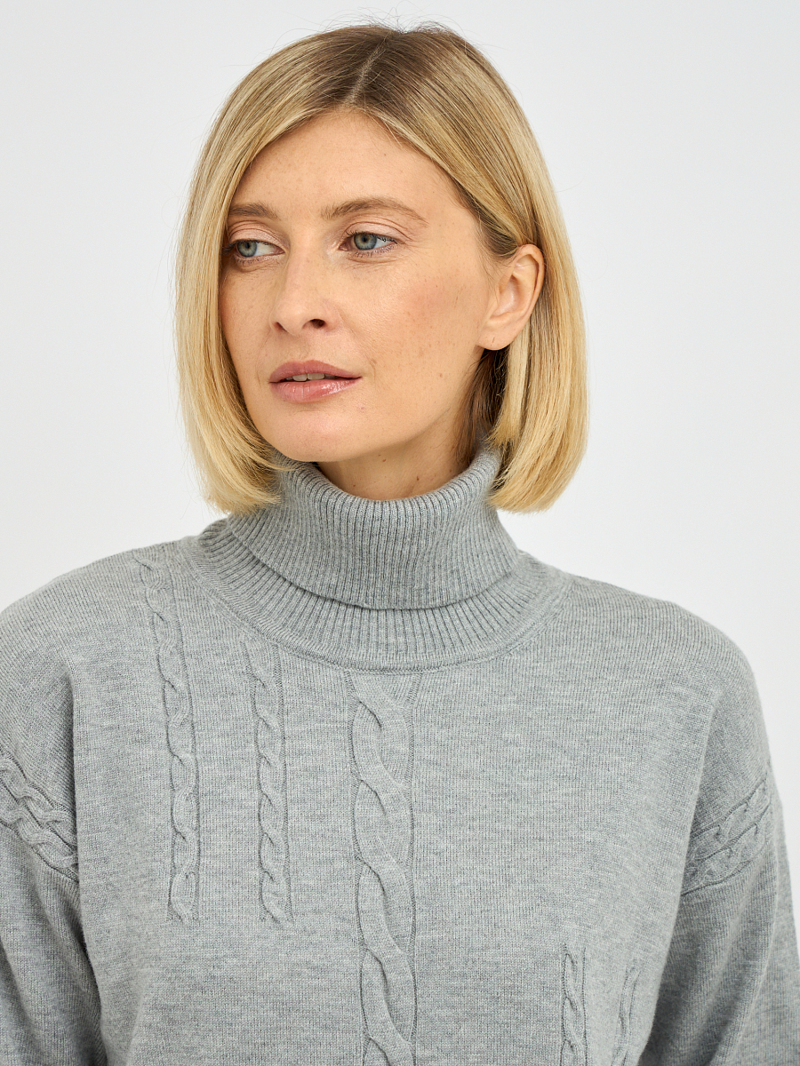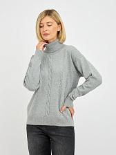 Эта женская водолазка в сером оттенке идеальный выбор для создания утонченных и уютных образов. Дизайн водолазки отличается своей лаконичностью и элегантностью, что позволяет легко сочетать её с различными элементами гардероба. Оригинальный узор в виде косички на передней части добавляет изюминку и делает образ более интересным. Высокий воротник-стойка надежно защищает от холода и ветра, создавая дополнительный комфорт.