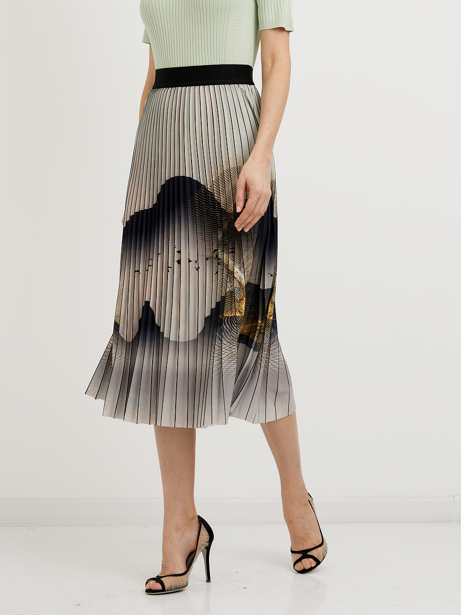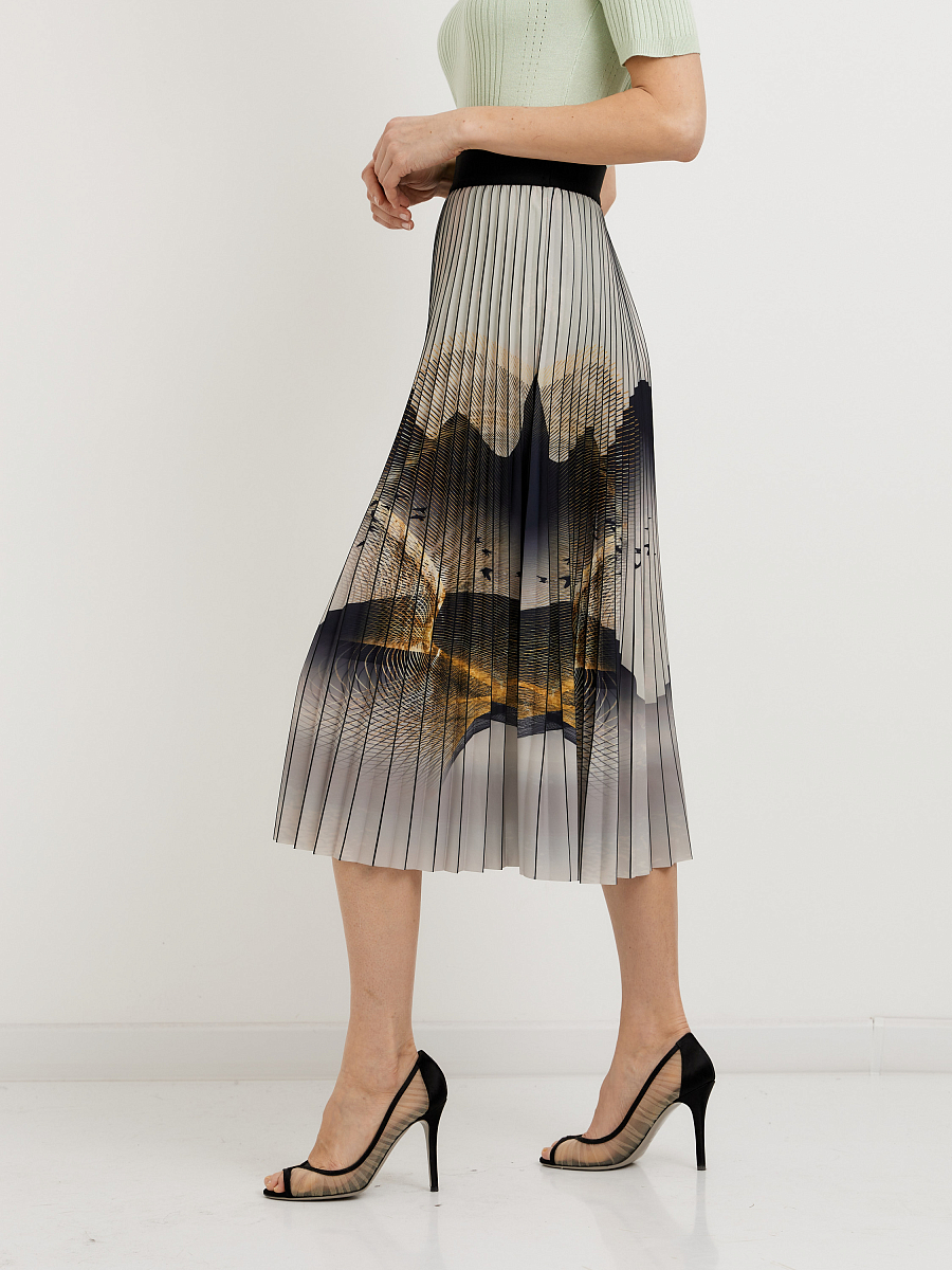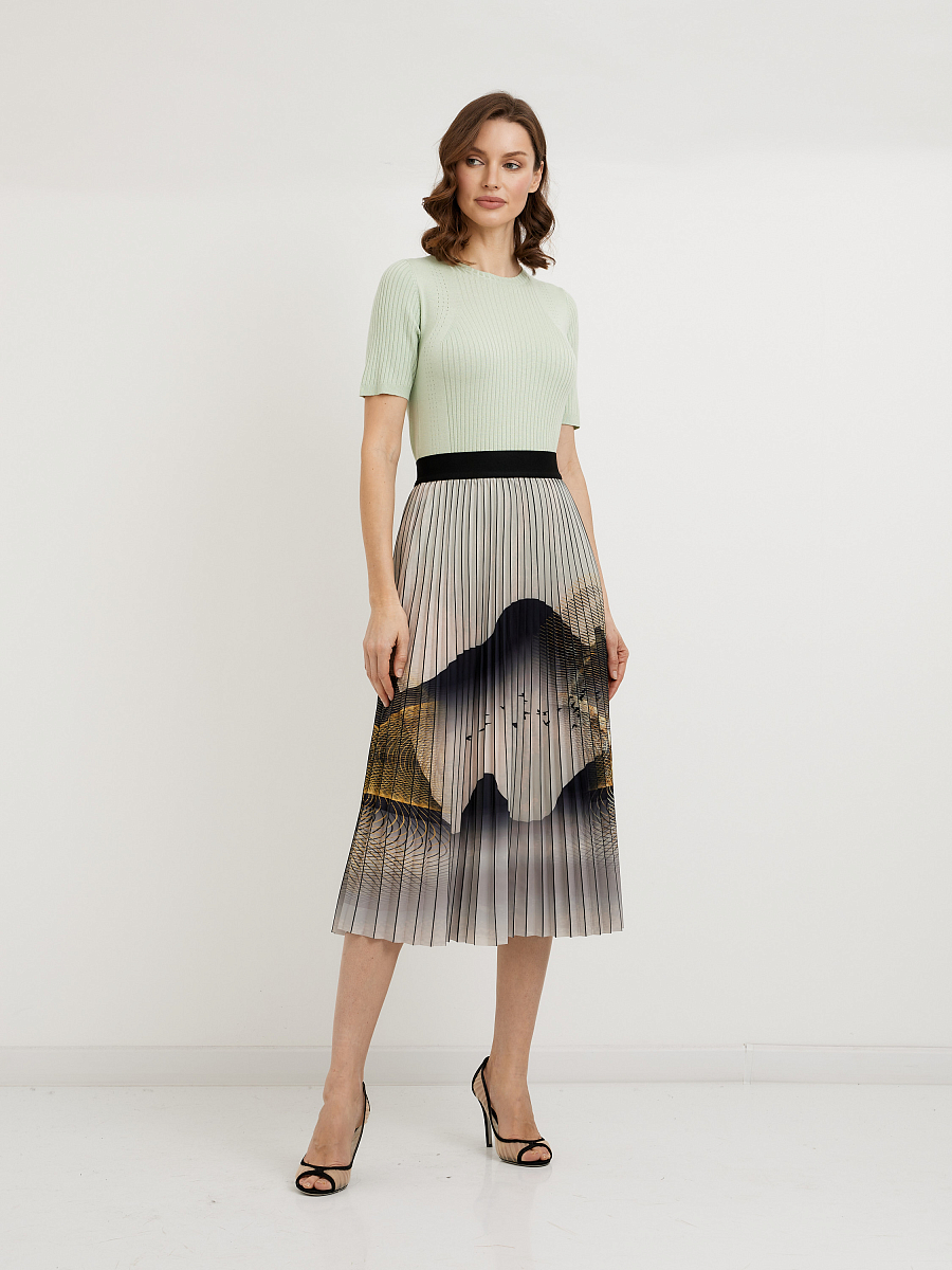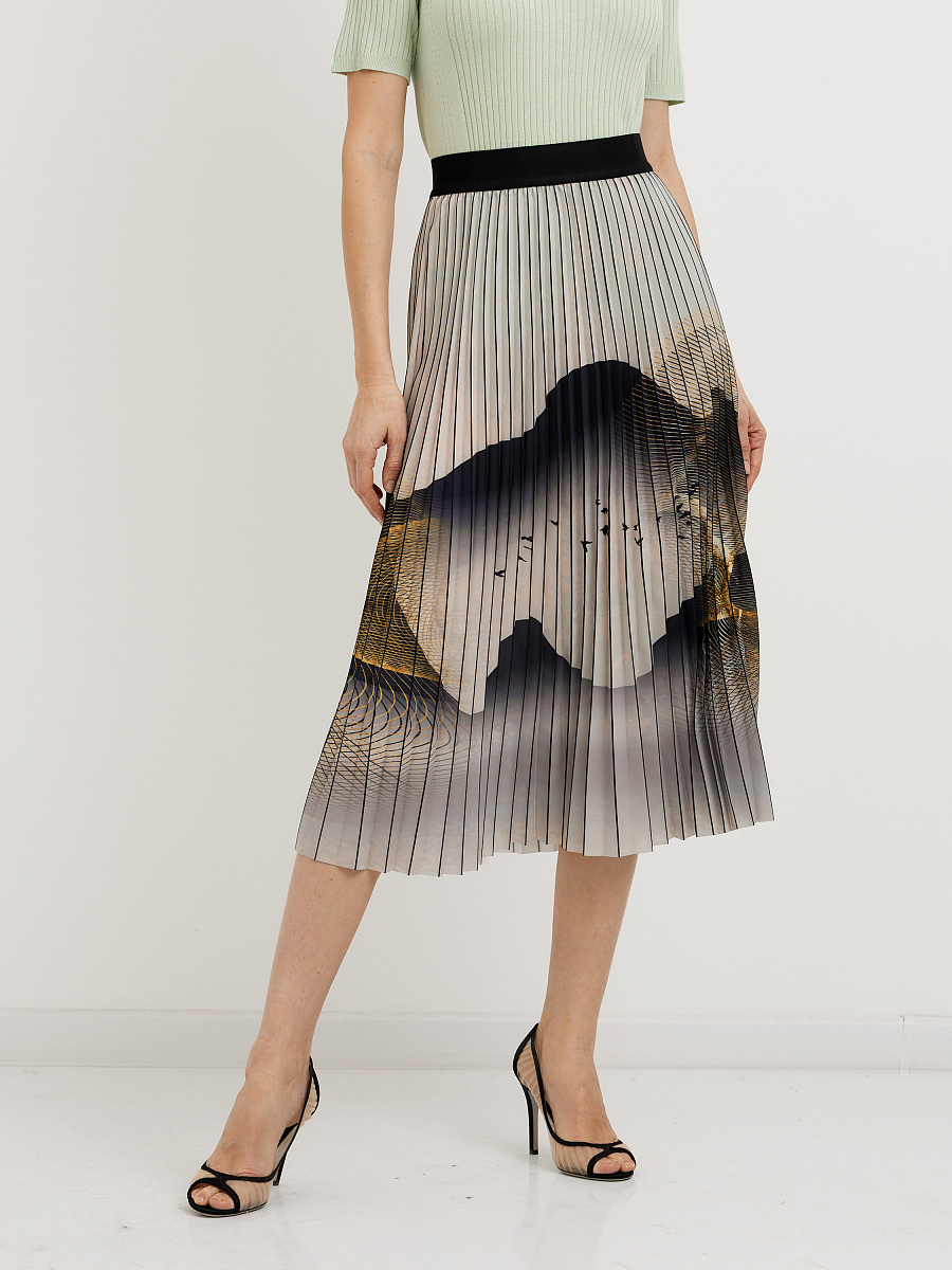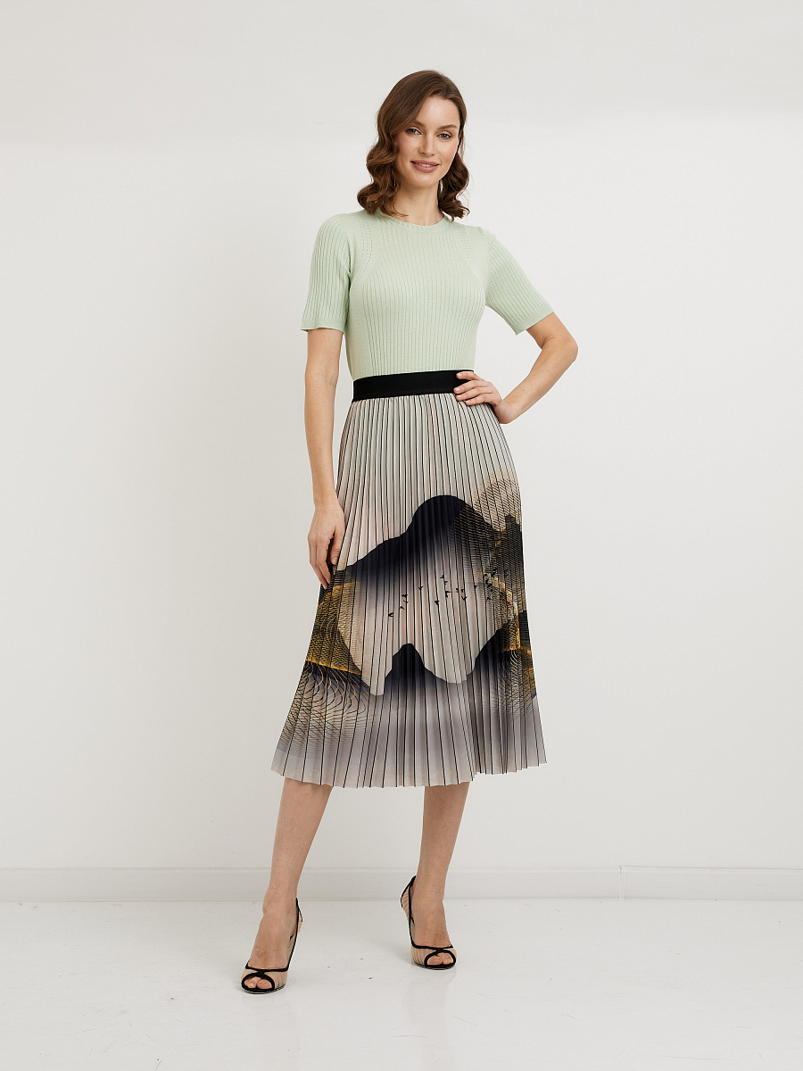 Юбка-плиссе длины миди с принтом гор - это очень интересный и необычный элемент гардероба. Вот несколько идей, с чем можно сочетать такую юбку: