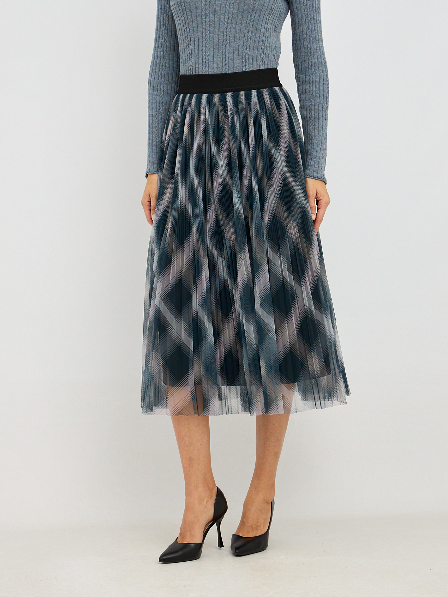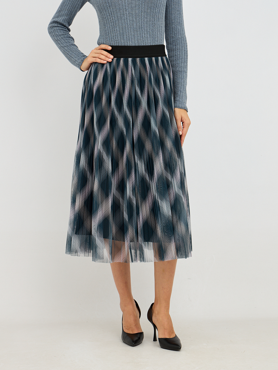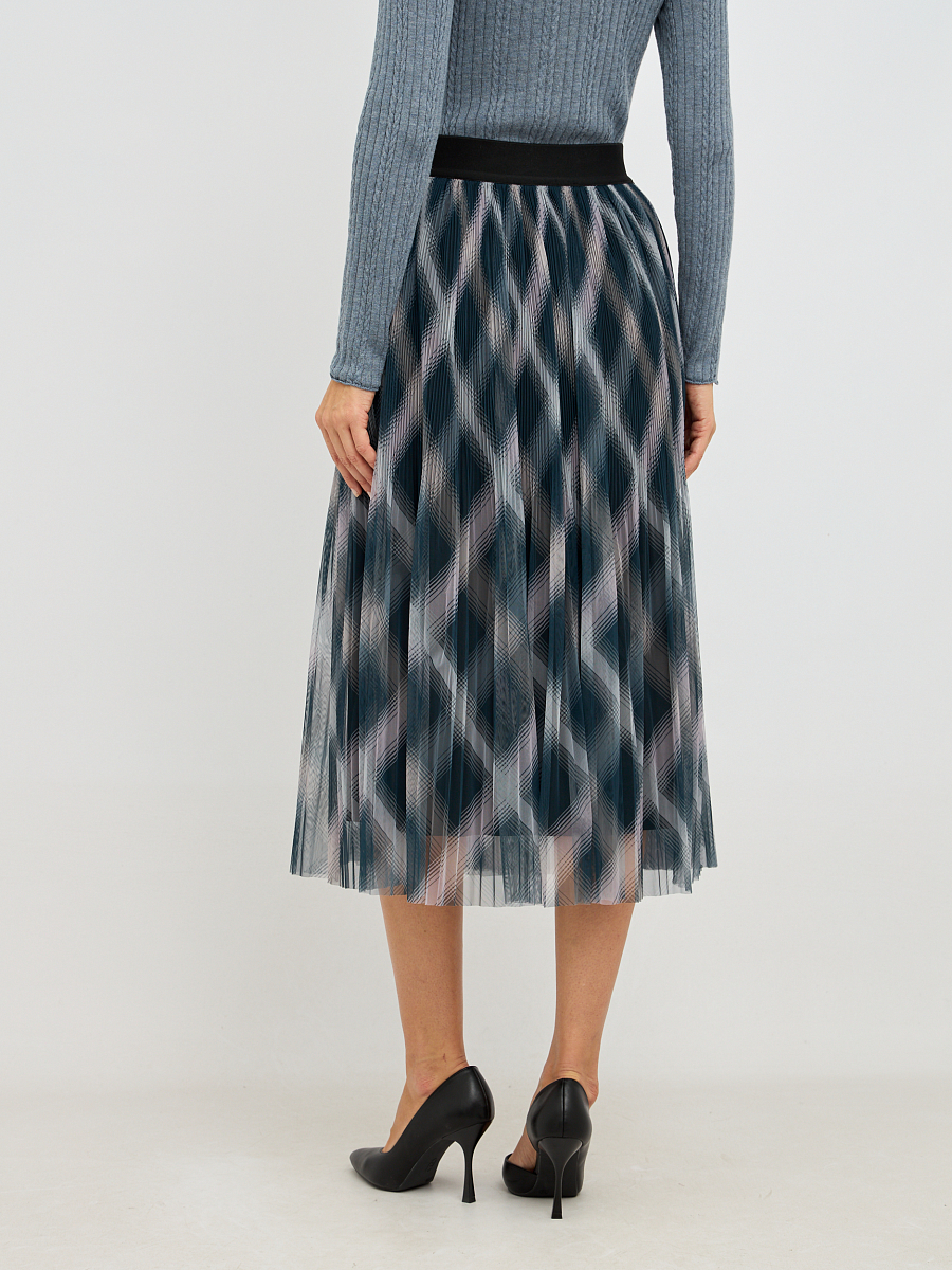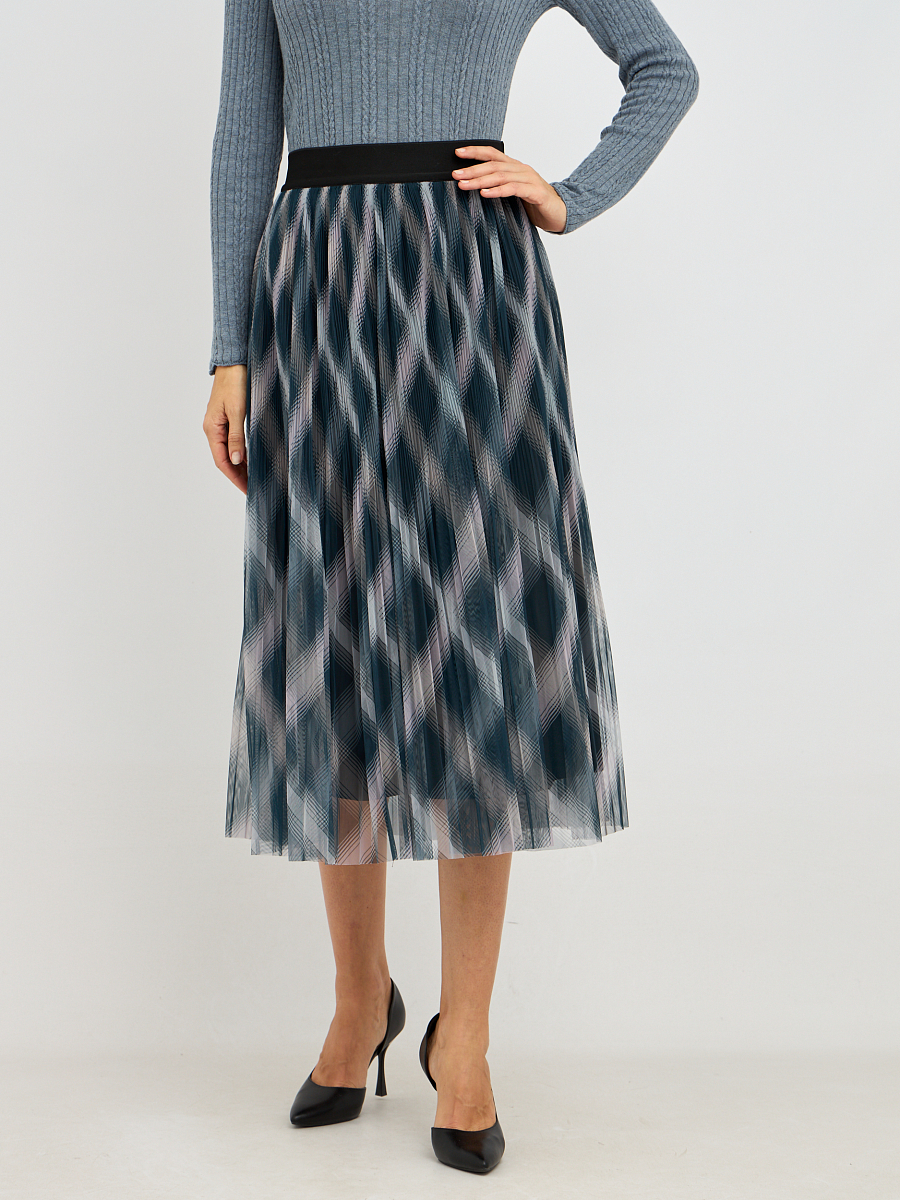 Особенностью дизайна является интересный рисунок, напоминающий ромбы, который придает юбке уникальность и современный вид. Такой принт делает юбку не только элегантной, но и модной, позволяя создать запоминающийся образ.