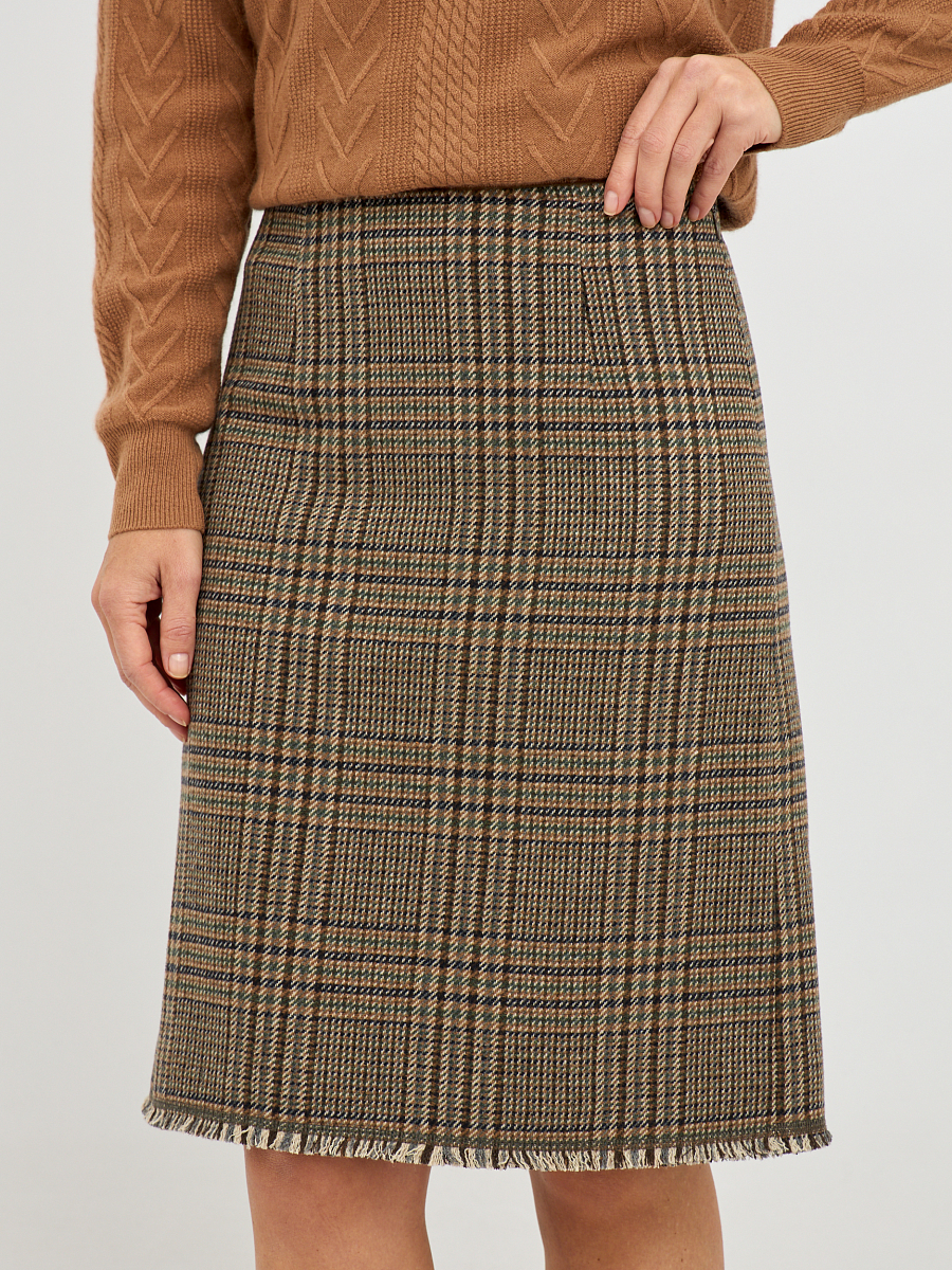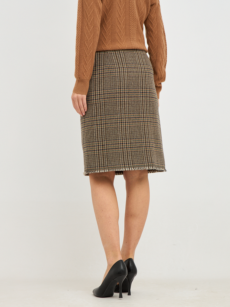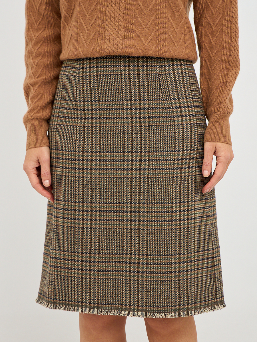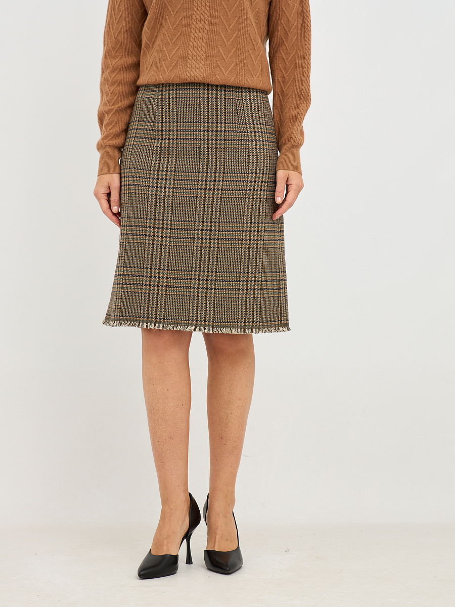 Универсальный прямой крой юбки прекрасно подчеркивает фигуру, скрывая недостатки и акцентируя достоинства. Клетка – вечный узор, который добавляет образу изысканности и шарма. Крой юбки позволяет сочетать ее с разными видами обуви: от элегантных каблуков до удобных ботинок. Благодаря сдержанной цветовой гамме, юбка легко сочетается с различными верхами, создавая множество стильных образов. Легкая бахрома по низу изделия добавляет юбке непринужденности и игривости, делая ее более современной и стильной.