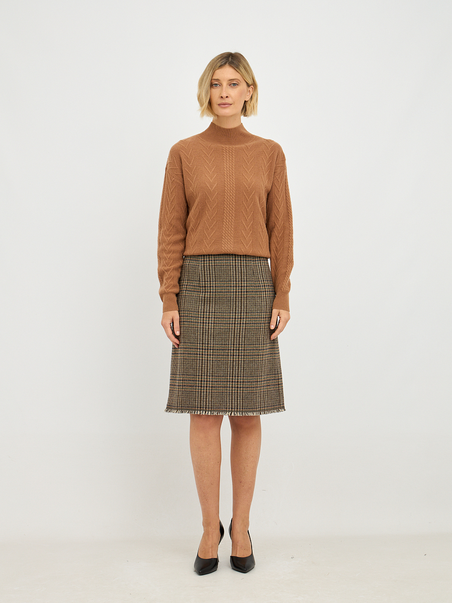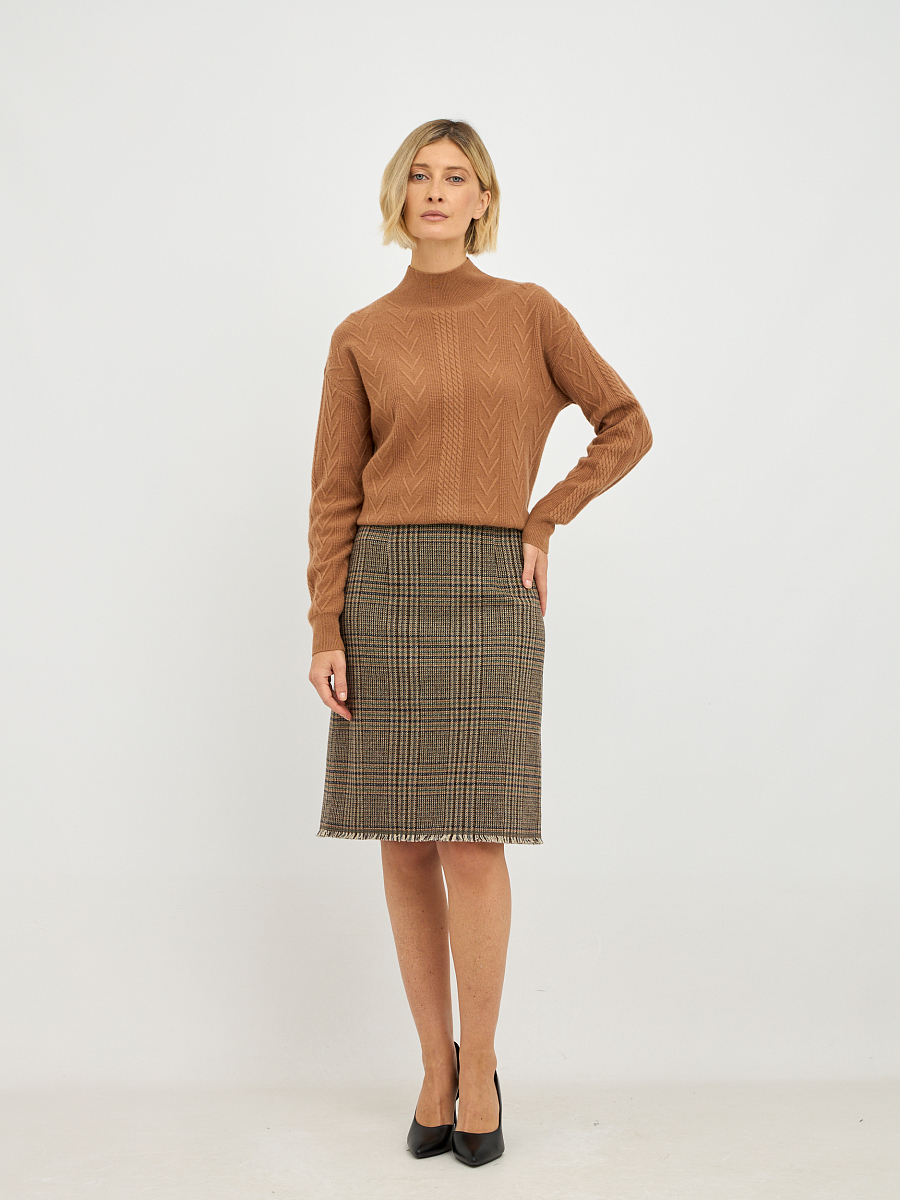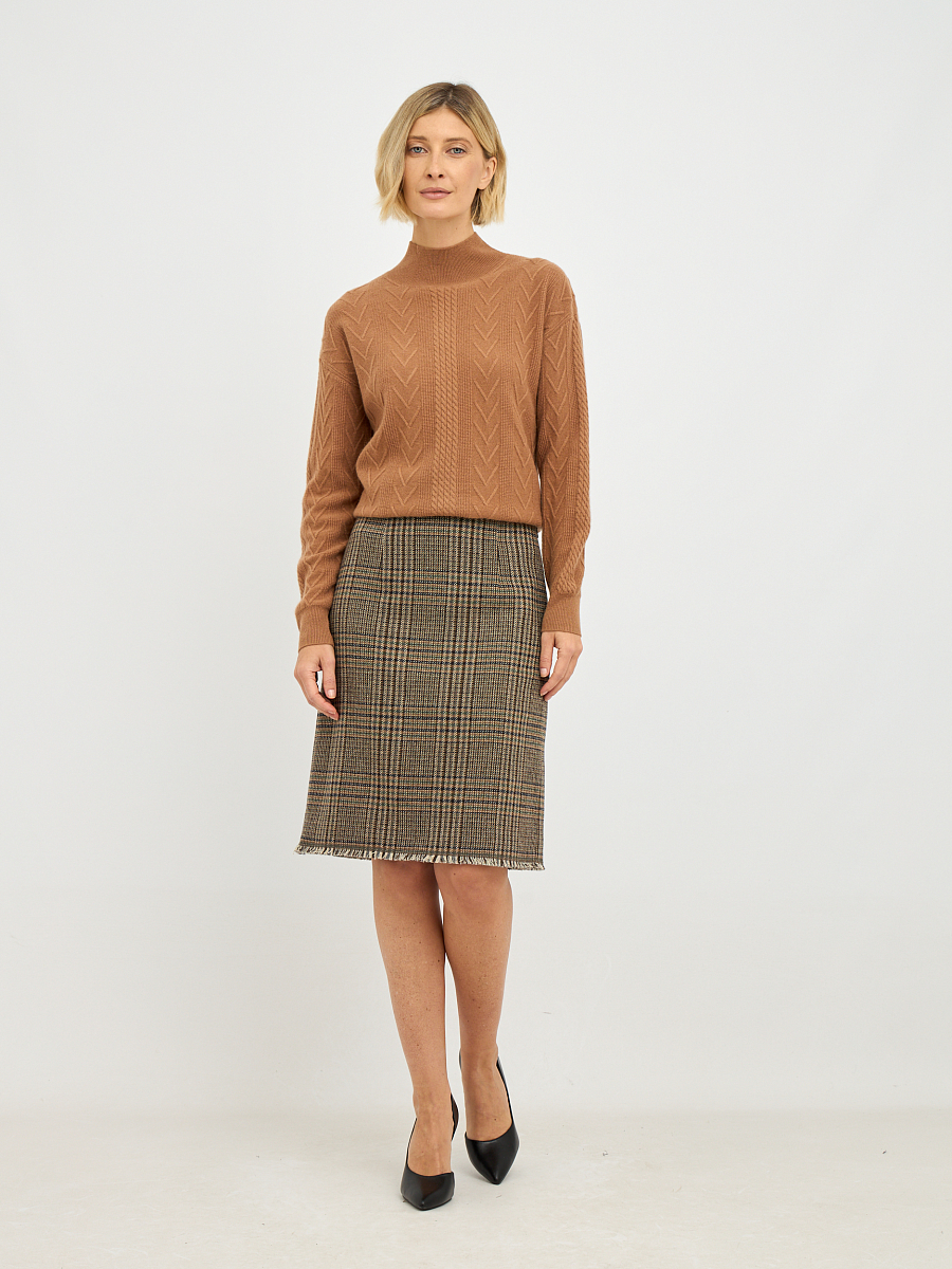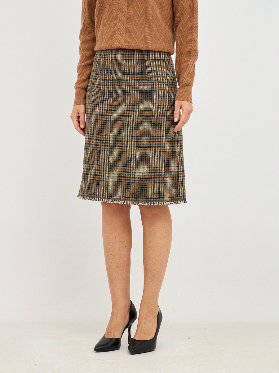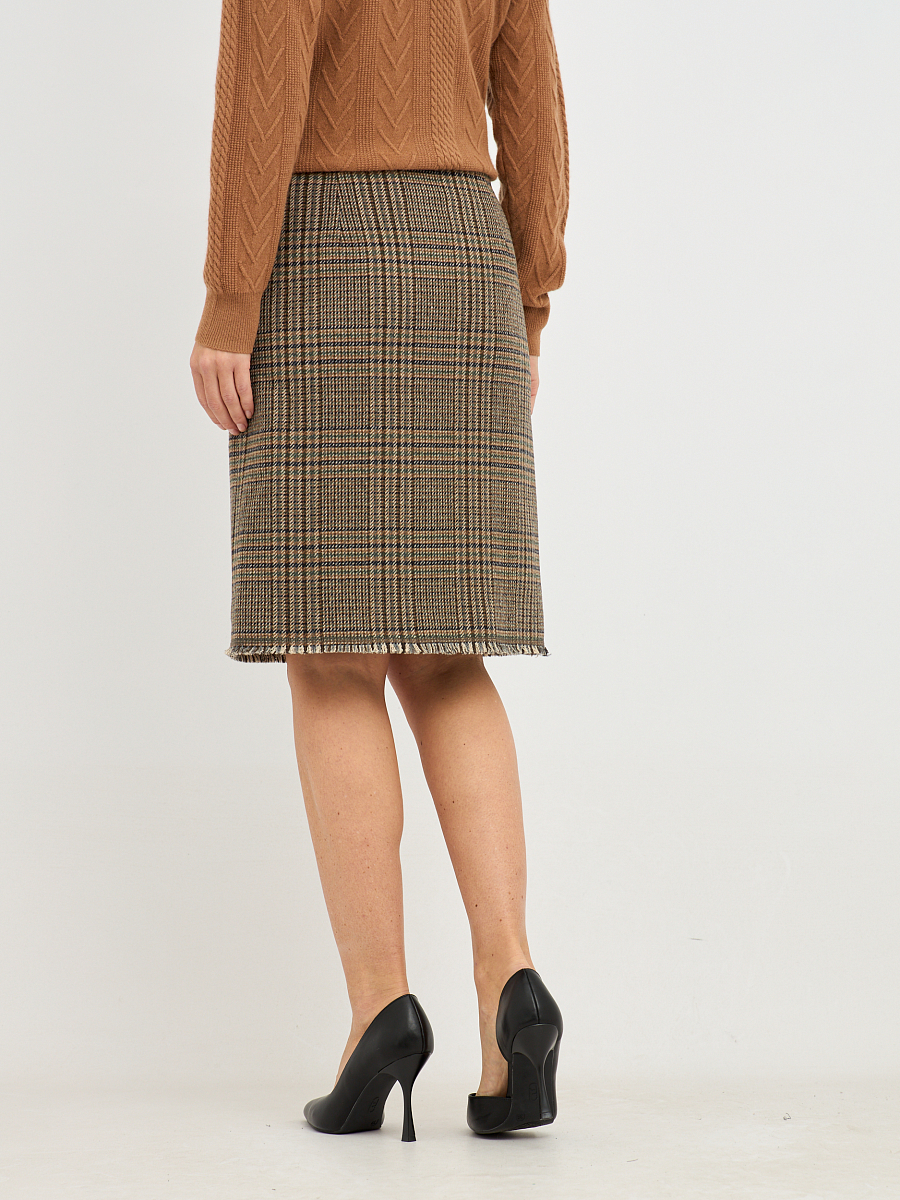 Универсальный прямой крой юбки прекрасно подчеркивает фигуру, скрывая недостатки и акцентируя достоинства. Клетка – вечный узор, который добавляет образу изысканности и шарма. Крой юбки позволяет сочетать ее с разными видами обуви: от элегантных каблуков до удобных ботинок. Благодаря сдержанной цветовой гамме, юбка легко сочетается с различными верхами, создавая множество стильных образов. Легкая бахрома по низу изделия добавляет юбке непринужденности и игривости, делая ее более современной и стильной.