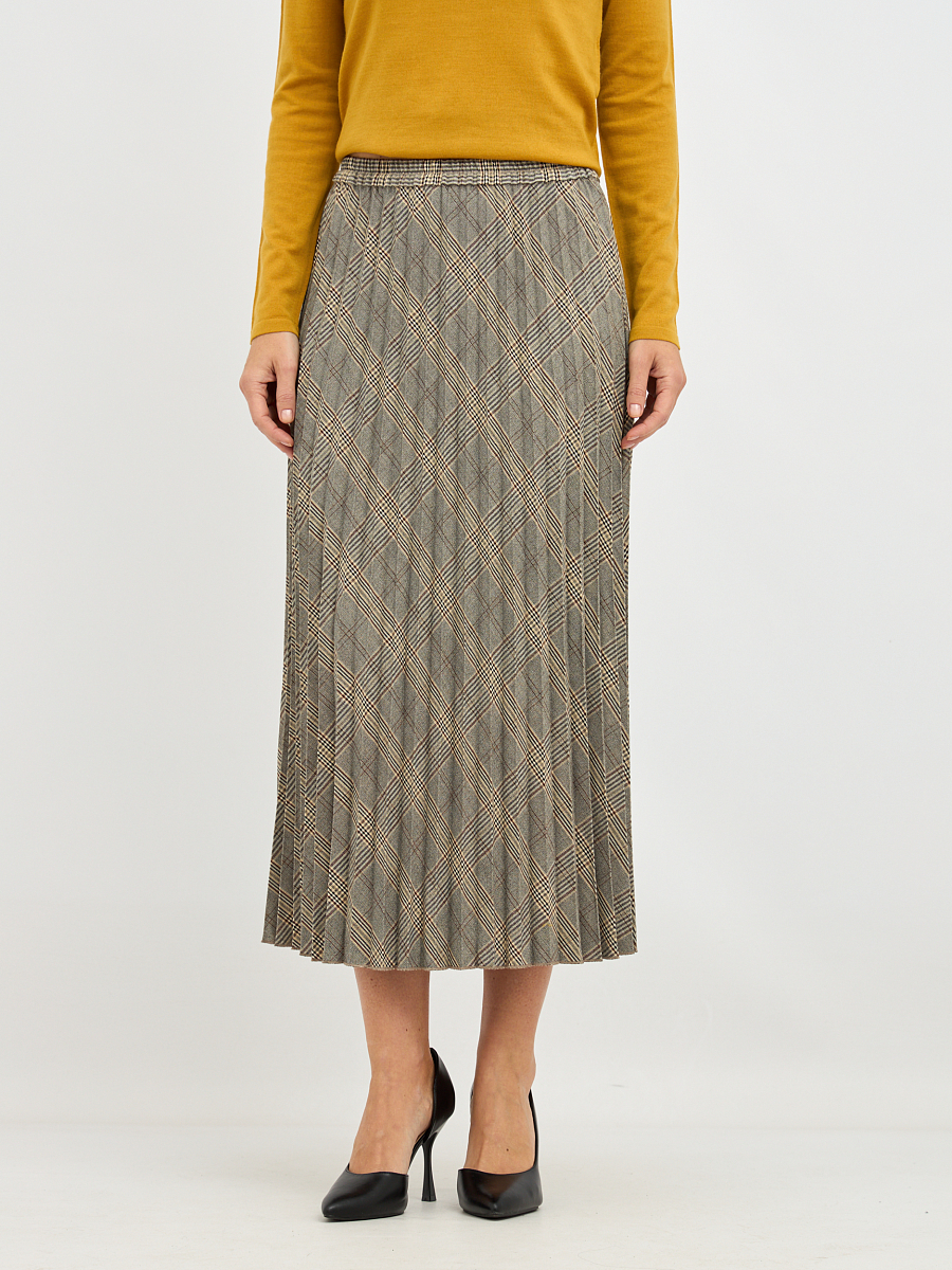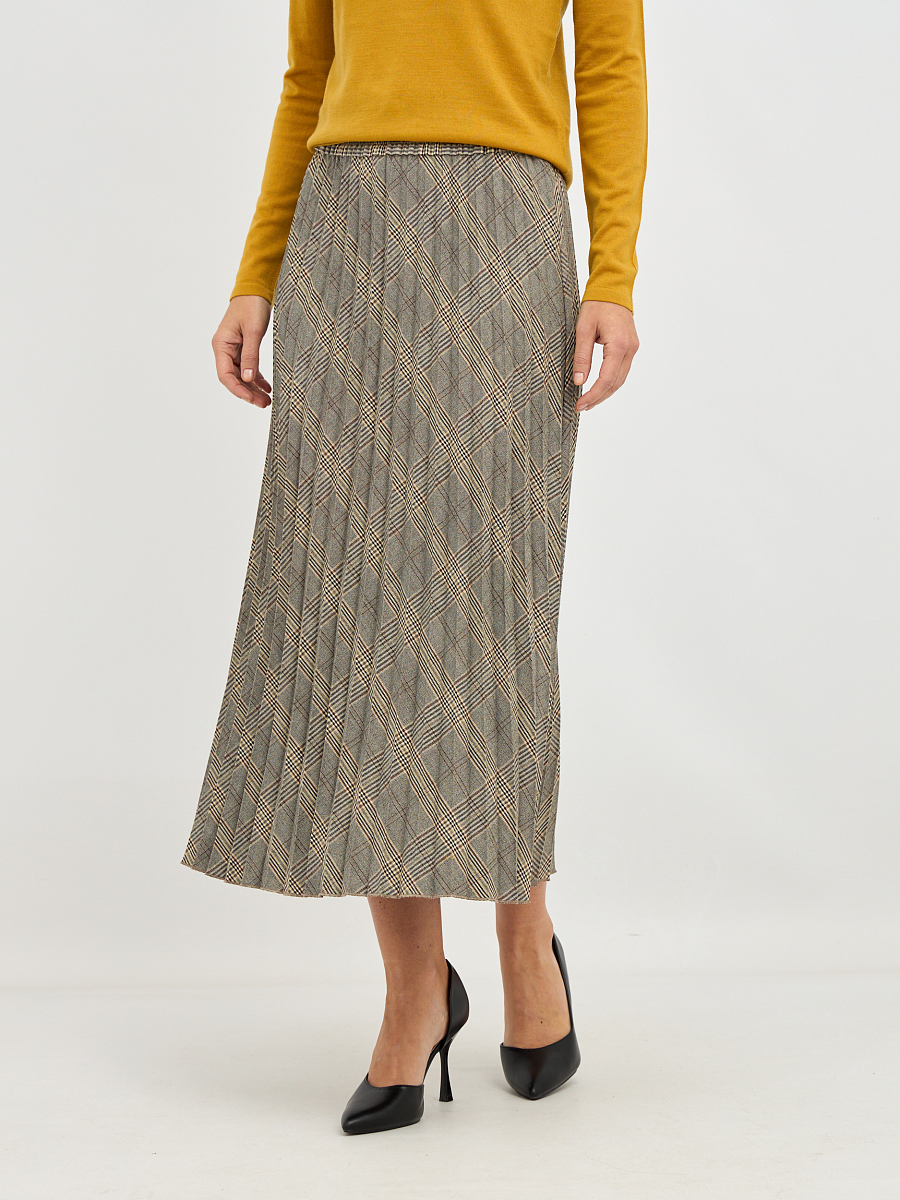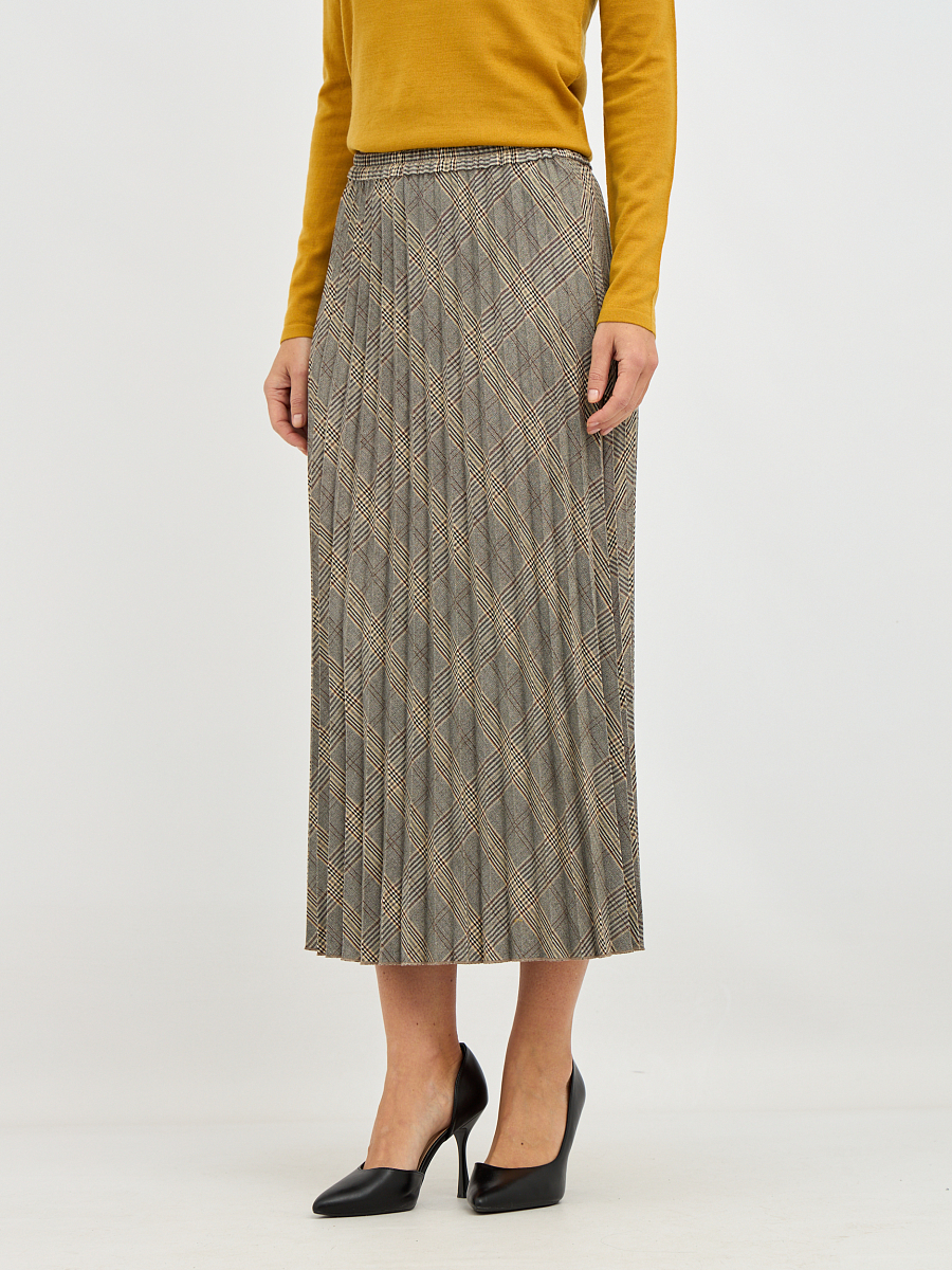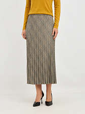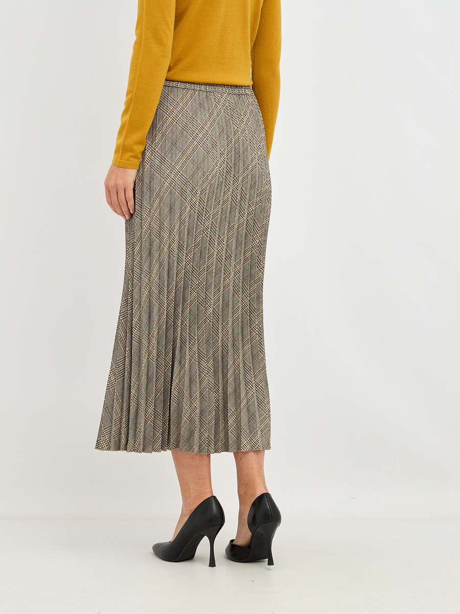 Эта элегантная миди-юбка выполнена из плотной ткани с классическим клетчатым узором, который сочетает оттенки серого, бежевого и коричневого. Благодаря спокойной цветовой гамме она легко комбинируется как с однотонными базовыми джемперами и водолазками, так и с более выразительными комплектами.