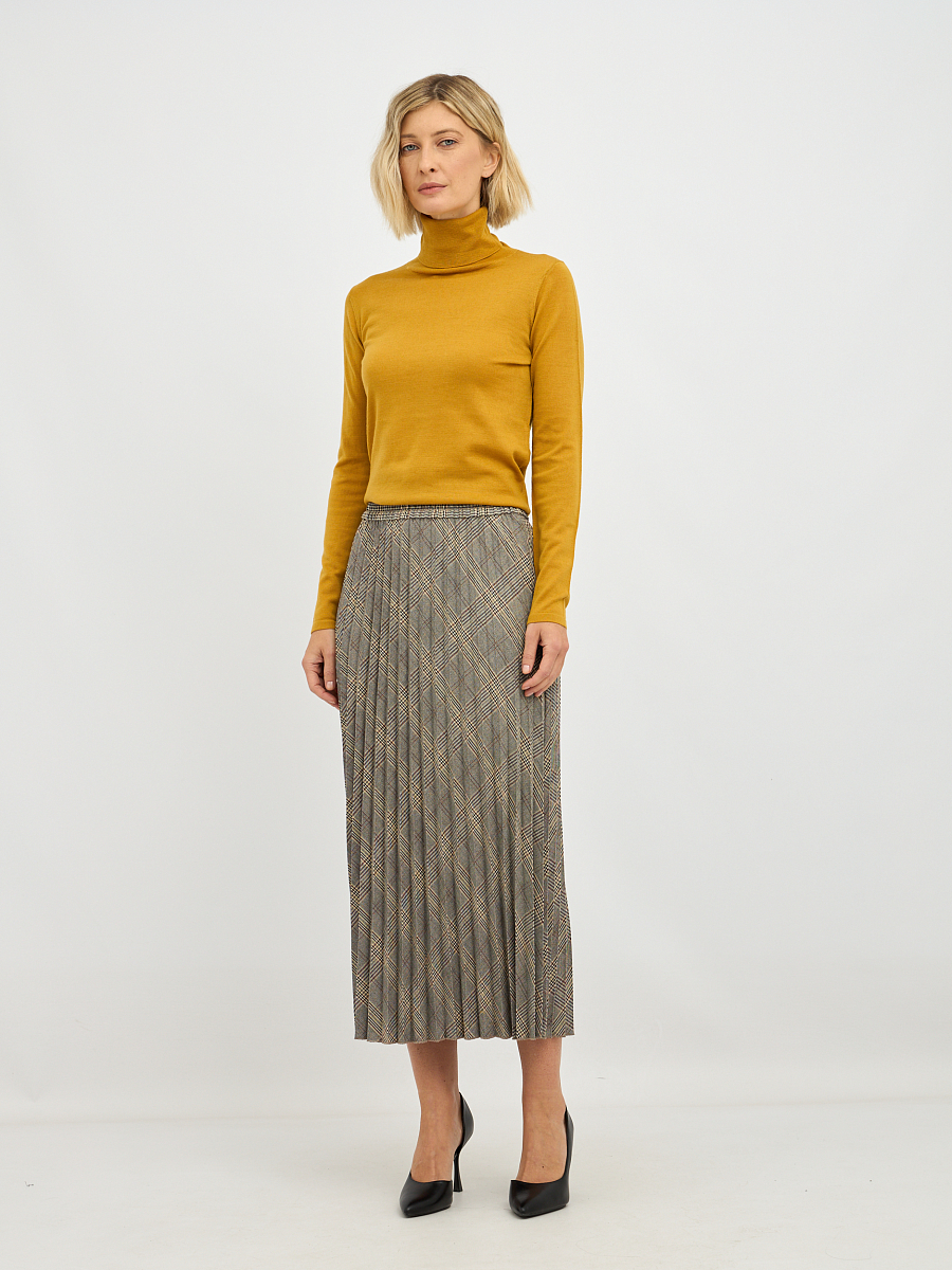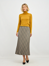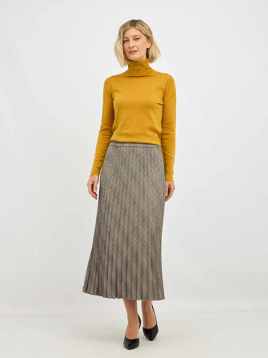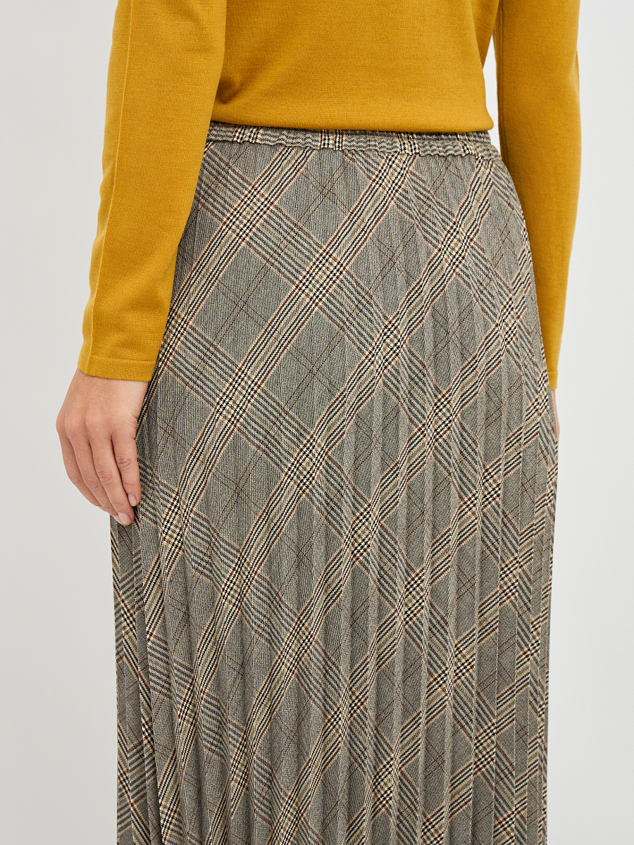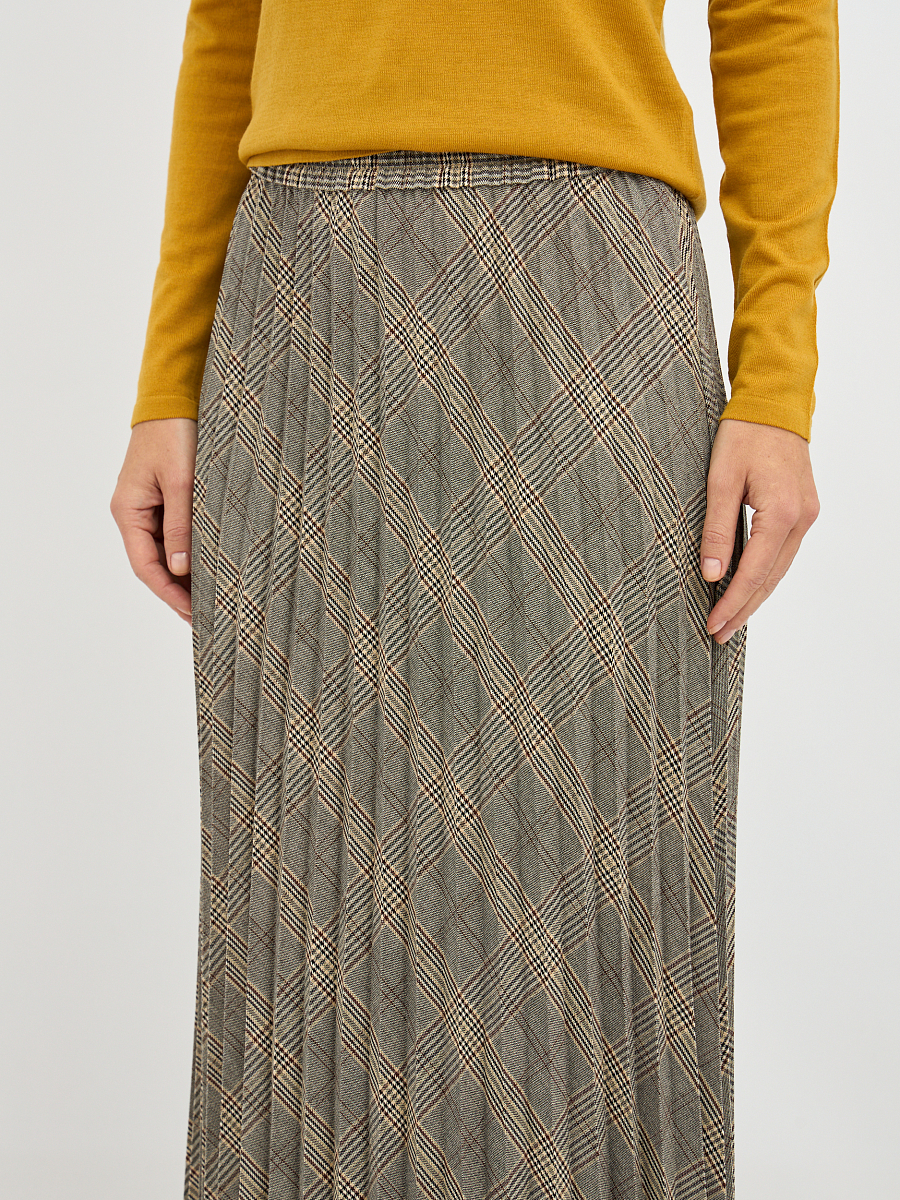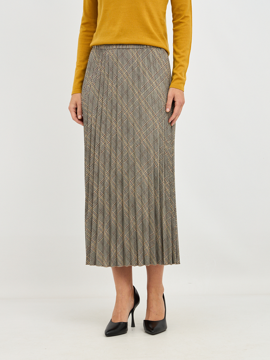 Эта элегантная миди-юбка выполнена из плотной ткани с классическим клетчатым узором, который сочетает оттенки серого, бежевого и коричневого. Благодаря спокойной цветовой гамме она легко комбинируется как с однотонными базовыми джемперами и водолазками, так и с более выразительными комплектами.